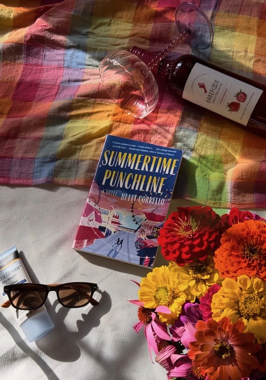 A colorful scene with a checkered cloth, a bottle of strawberry sparkling water, a glass, a book titled "Summertime Punchline" by Betty Cerrillo, a pair of sunglasses, a tube of Burt's Bees lotion, and a bouquet of vibrant flowers including red, yellow, orange, and pink blossoms.